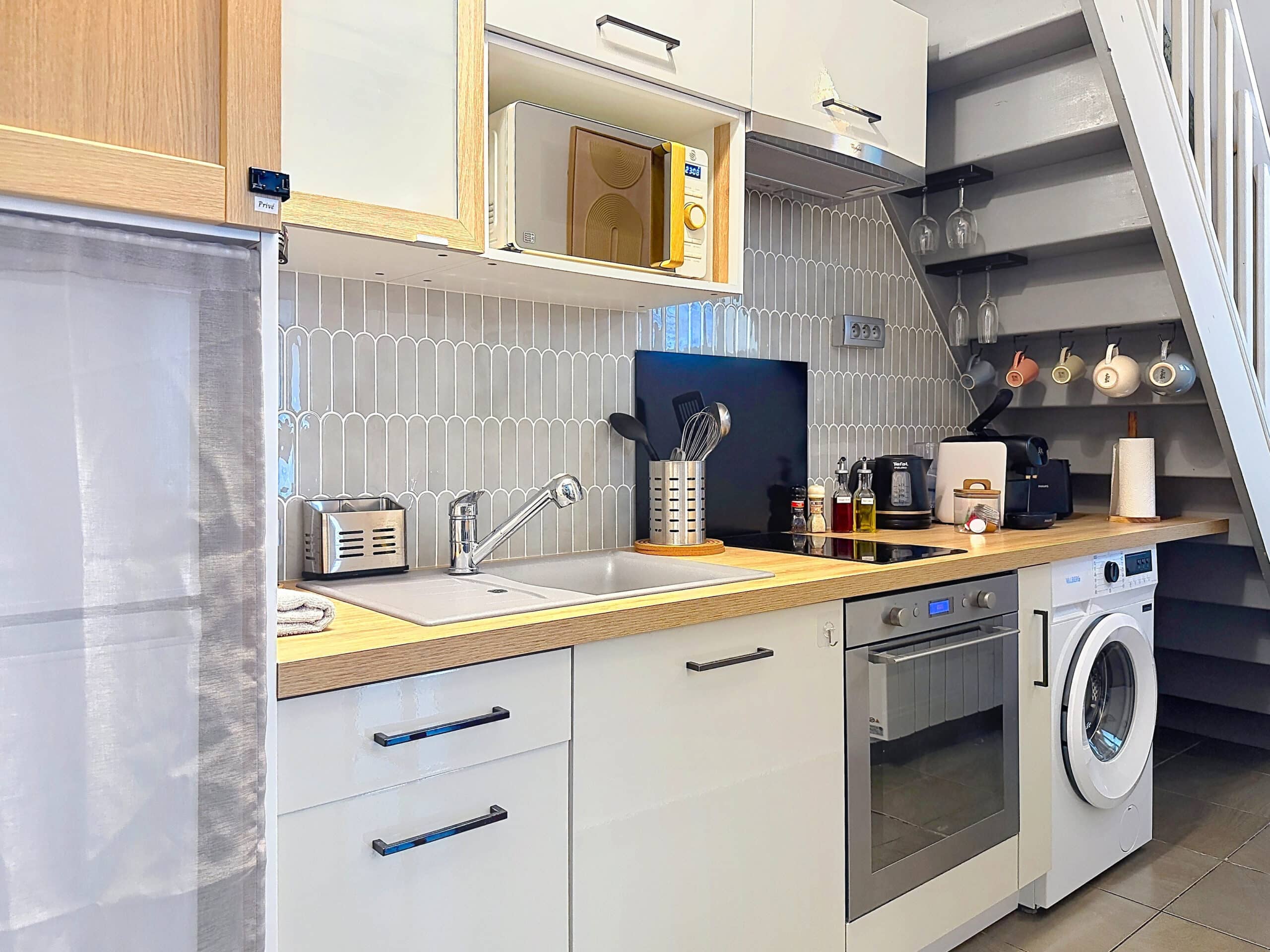 → CUISINE ENTIÈREMENT ÉQUIPÉE (four, micro-ondes, plaques à induction, réfrigérateur, machine à laver, cafetière Nespresso, bouilloire, grille-pain, ustensiles, verres à vin) pour un séjour en totale autonomie, comme à la maison.