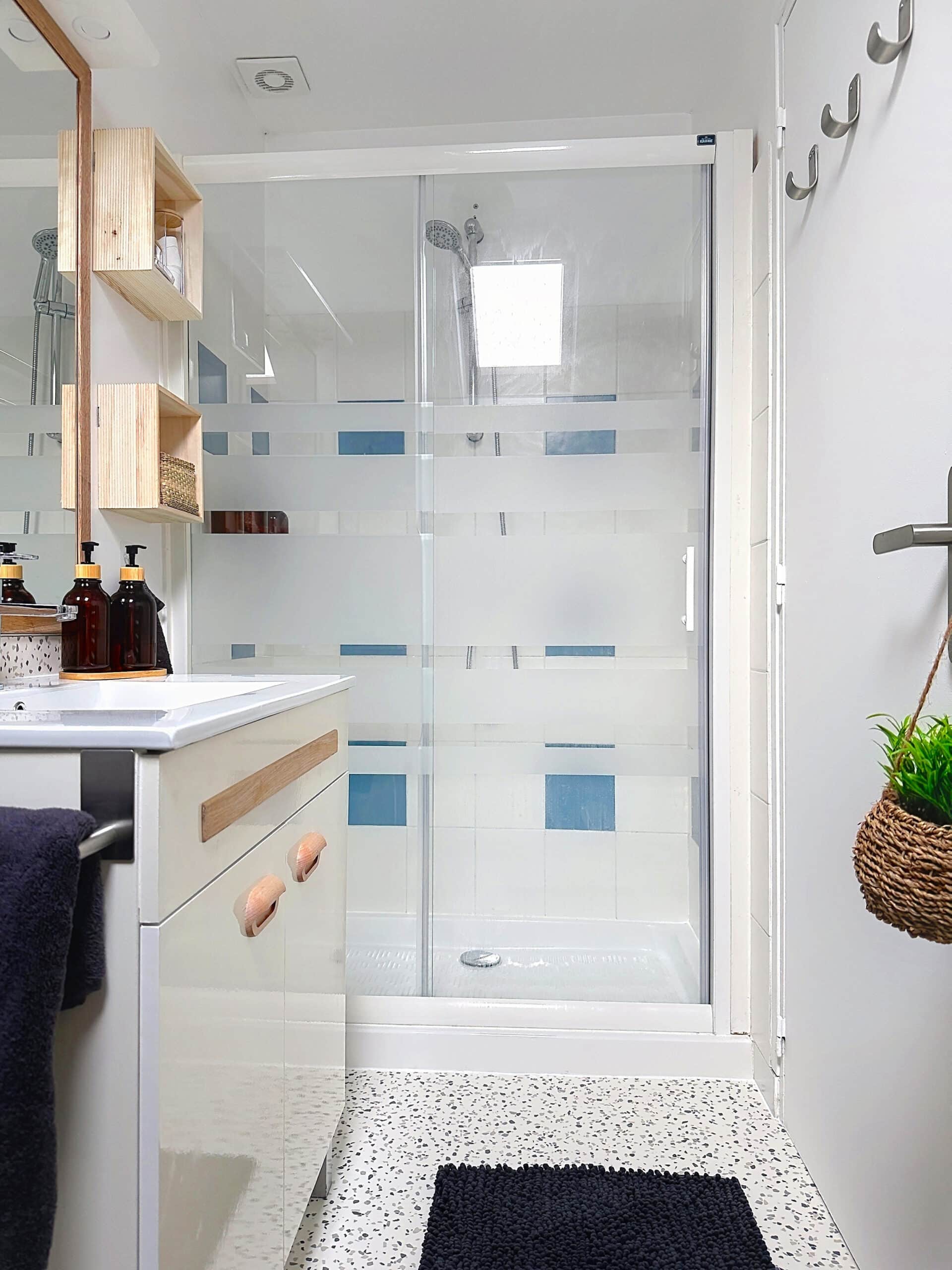 → SALLE D’EAU MODERNE avec douche, sèche-serviettes, sèche-cheveux et linge de bain fourni, pour un confort optimal.